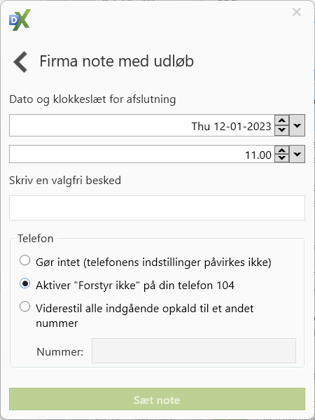 Højreklik på kontakten. Ved at klikke på "Angiv note for kontakt", får du mulighed for at aktivere en note for kollegaen. (Hvis der er et grønt flueben overfor en note, angiver den blot, at den note i øjeblikket er aktiveret). Vælg den note du vil aktivere for kollegaen, ved at dobbeltklikke på den. Hvis noten har indstillinger for udløb eller telefon-funktioner, skal du indstille dem - se billede nedenunder. Her vælges tidspunkt og funktion. Afslut ved at klikke på "Sæt note".