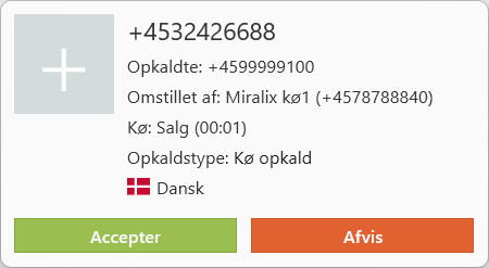 Hvis den eksterne kontakt er oprettet i Miralix Greenbox med yderligere info i brugerfeltet 1-6, vil disse vises i indholdsfeltet under “Opkalder”.