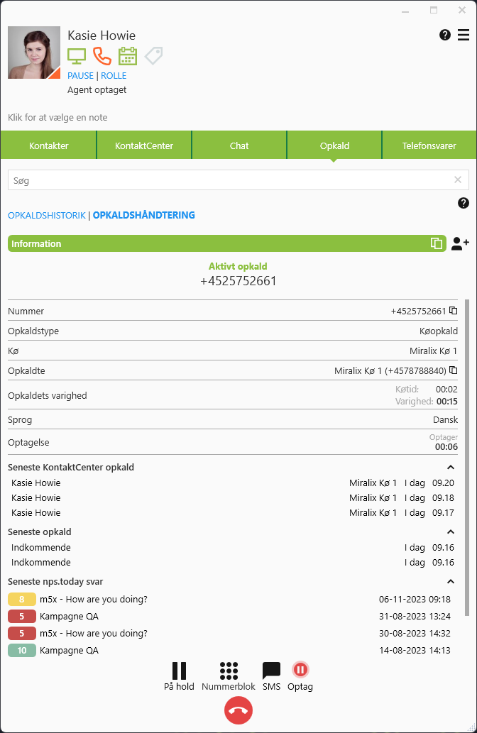 Seneste KontaktCenter opkald | Viser alle agenters og KontaktCenters opkaldshistorik med opkalder. |