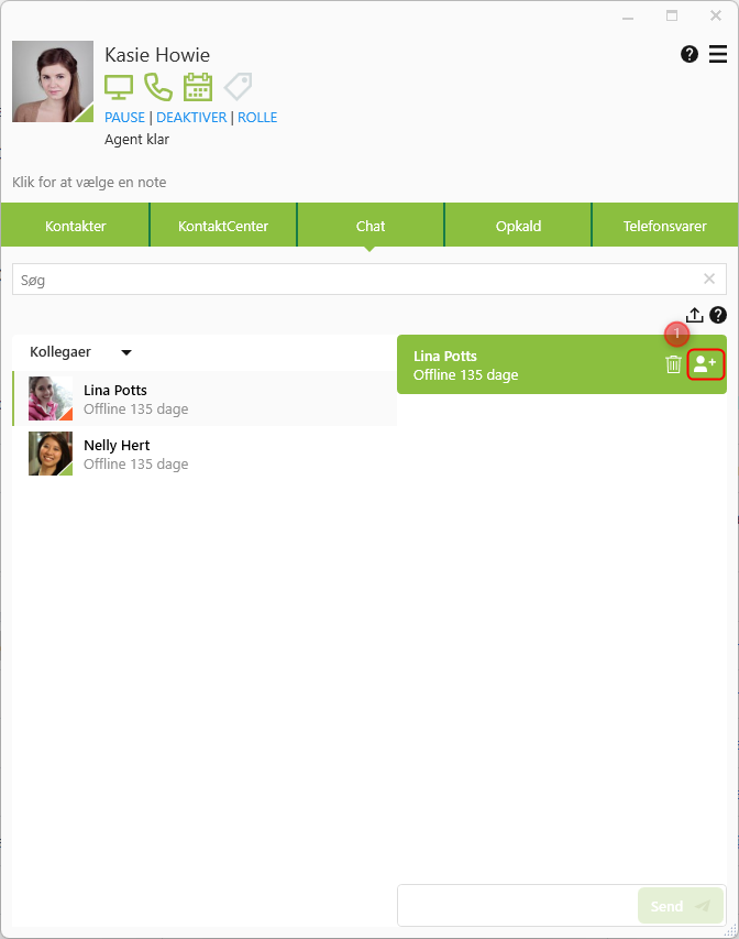 Klik på skraldespand-ikonet for at slette samtalen. Samtalen bliver også slettet for modparten, og fra databasen, så det er ikke muligt at få denne samtale tilbage igen.