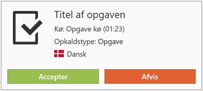 Du har mulighed for at acceptere eller afvise den indkommende task/opgave. Opgave-køen vil være synlig under KontaktCenter fanen – sammen med opkaldskøer.