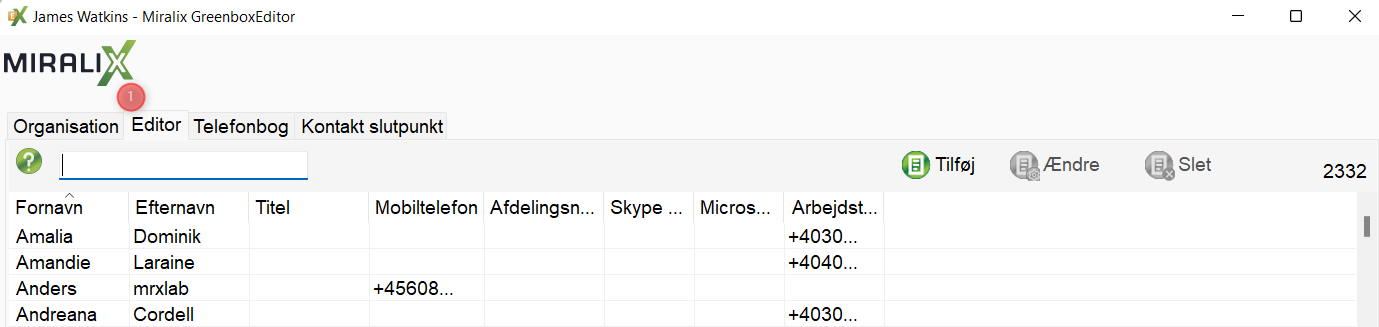 Under fanen ”Editor” oprettes interne brugere (1). Fanen indeholder bl.a. informationer om lokation. Lokation indeholder kontor og område som oprettes via fanen ”Editor”.