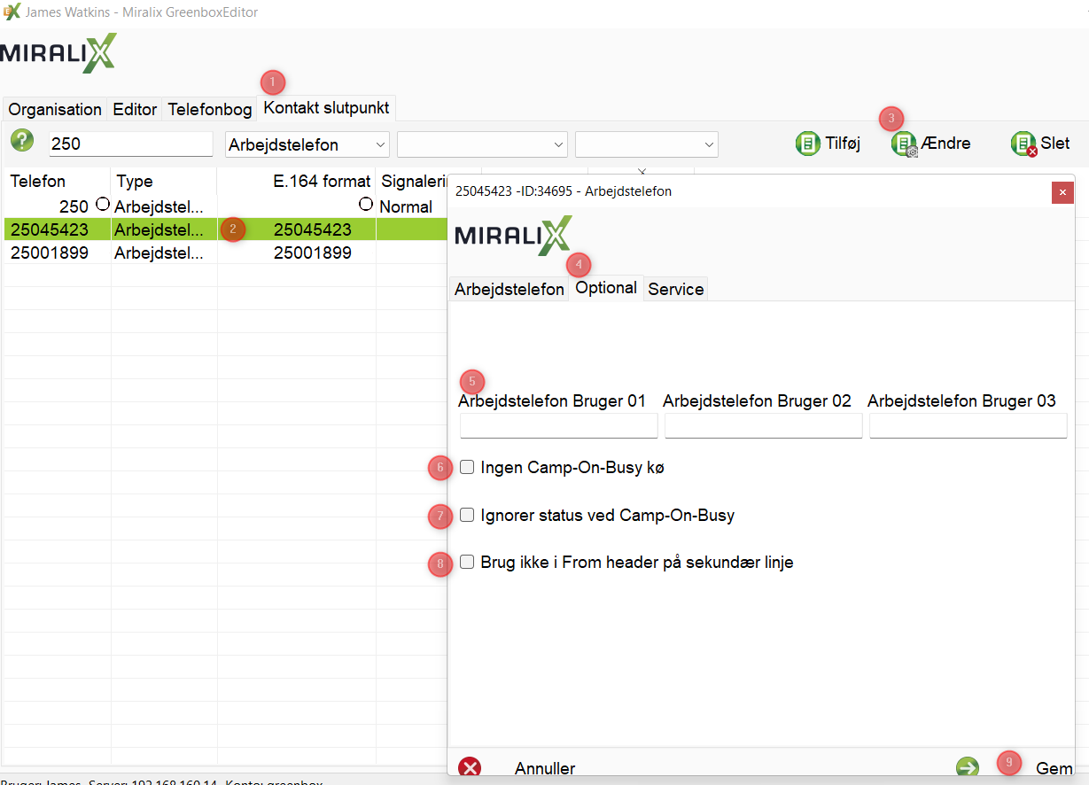 Indtast de ønskede data. Arbejdstelefon Bruger felterne kan kun benyttes i Miralix GreenboxEditor, ikke i Miralix klient programmer. (5)