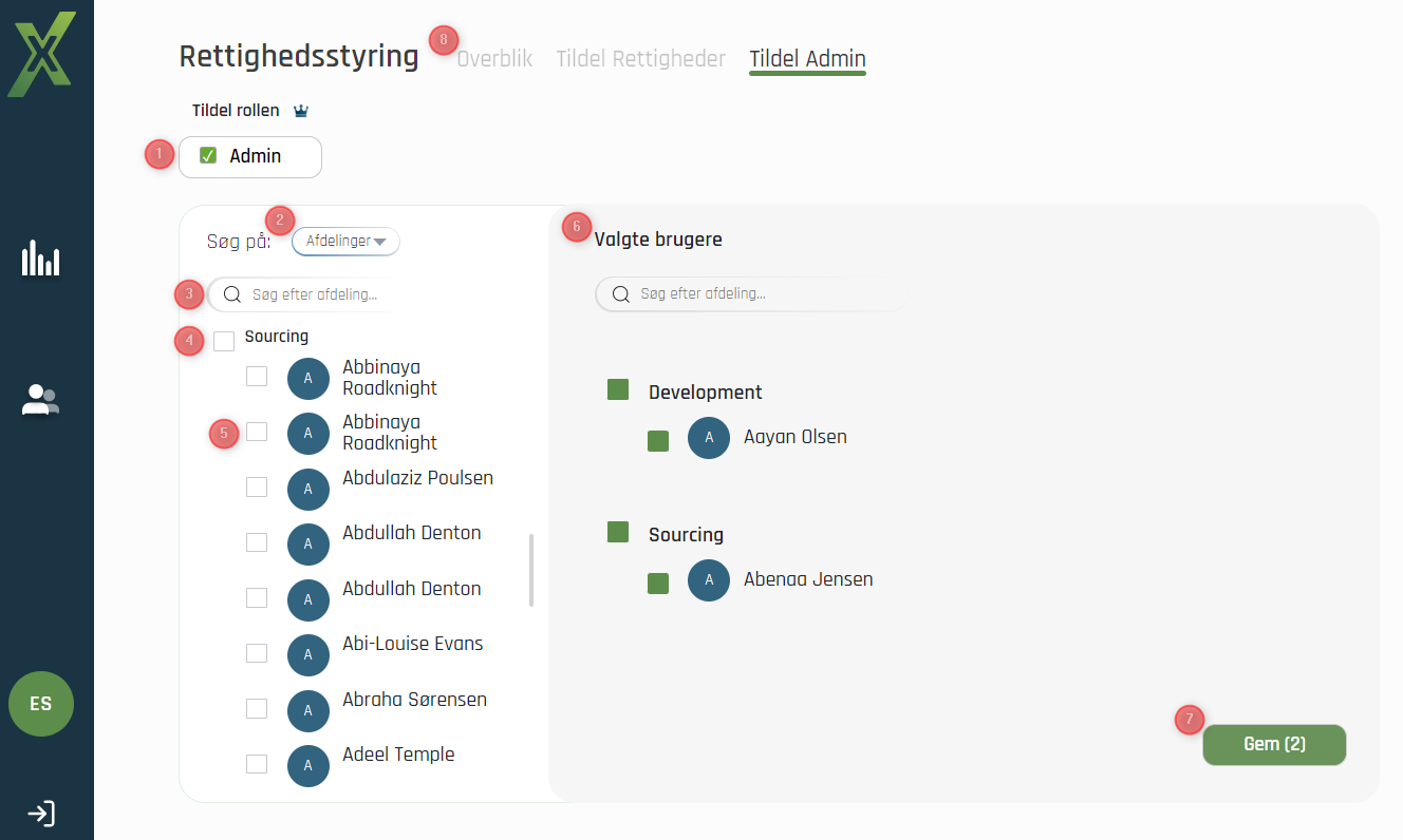 Når du har valgt brugerne, der skal have tildelt admin, så kan du trykke "Gem" (7), og de vil blive synlige i feltet "Overblik" (8) under "Admins".