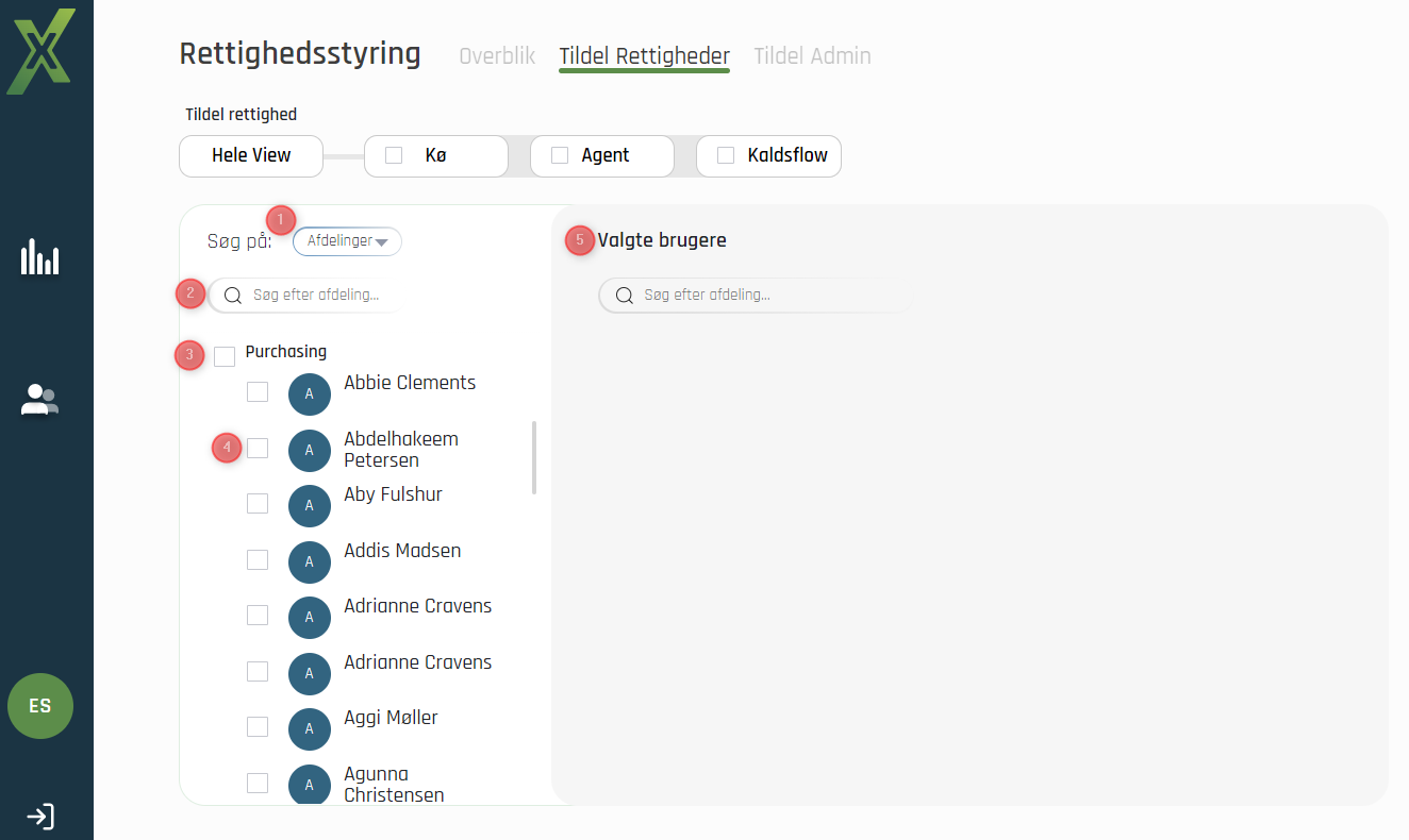 Du kan enten vælge alle brugere i afdelingen ved at markere checkboxen til venstre side af afdelingen (3), eller enkelte brugere ved at markere checkboxen til venstre for navnet af brugeren (4). Herefter vil de bliver vist under "Valgte brugere" (5).