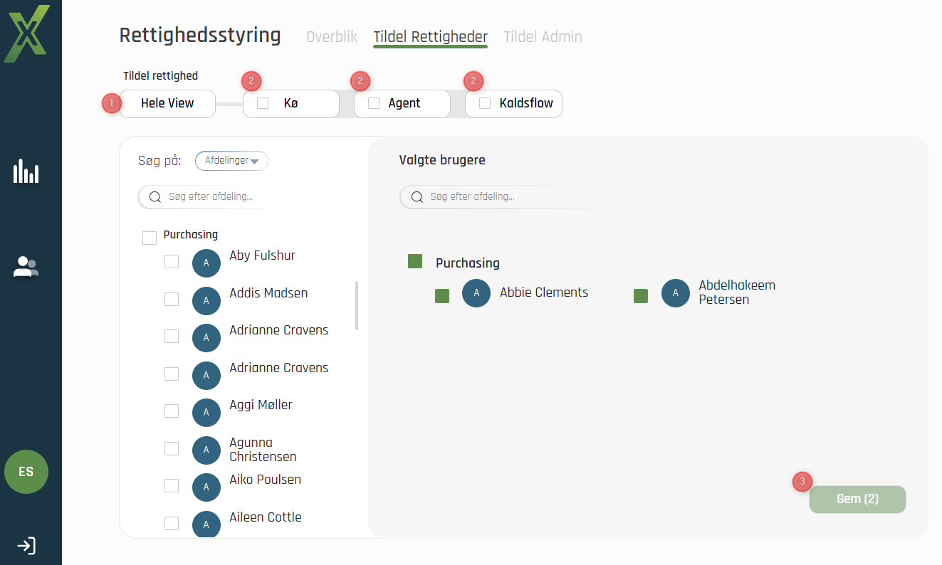 De valgte brugere kan du nu tildele rettigheder til. Du kan vælge at giver brugerne rettighed til "Hele View" (1) - her har brugeren alle rettigheder, som en administrator, men kan ikke lave/ændre rettigheder for andre brugere. Du kan også vælge at give de valgte brugere specifik adgang ved at klikke på "Kø", "Agent" og/eller "Kaldsflow" (2). Her kan du enten klikke på checkboxen - så markerer den automatisk f.eks. alle køer, eller du kan klikke på selve ordet "Kø", og du vil få et overblik over alle køer - og du har så muligheden for at vælge specifikke køer, som brugeren skal have adgang til.
