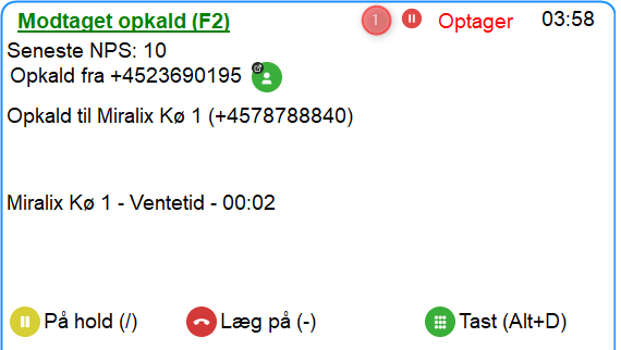 Call recording bruges til at optage samtale mellem opkalderen og dig. For at benytte call recording, så skal du have optage-licens tildelt i Supervisor (se Miralix Supervisor Add-on vejledning - Basis agent opsætning). Når indstillingen er aktiveret, så vil du have mulighed for at starte, pause og genoptage en optagelse på et kø-opkald, ved at trykke på optage-knappen. Optagelsen stopper først når samtalen slutter.