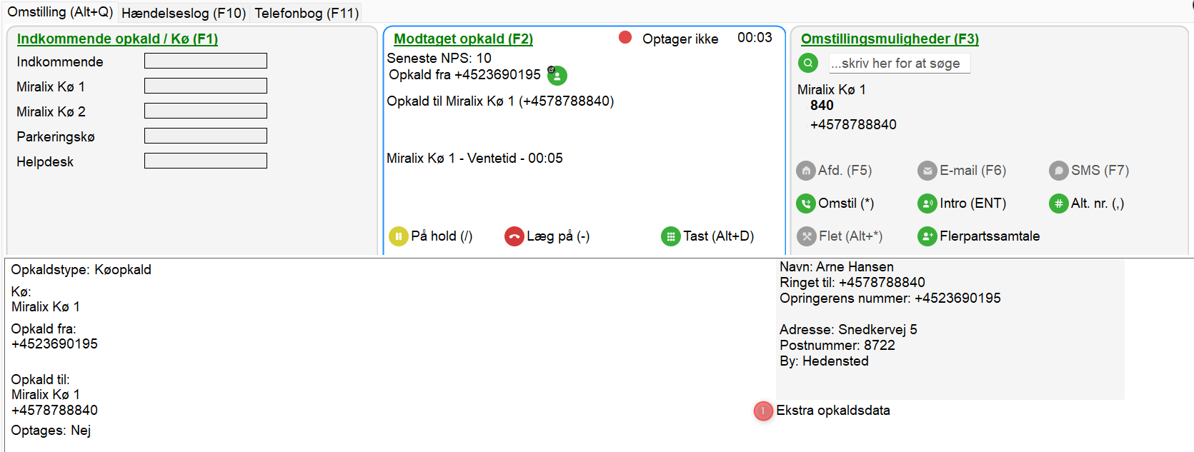 I forbindelse med Miralix Office Team opkald, kan der tilføjes ekstra opkaldsdata i Miralix Office Operator (1). Det kan være informationer fra CRM system eller informationer som bliver indtastet af den, der ringer ind, fx kundenummer. Hvilke informationer der vises, bestemmes under konfigurationen af Miralix Office Team og Miralix Office Operator. For at få vist information, "trækkes" linjen under F1 og F3 felterne ned med musen.