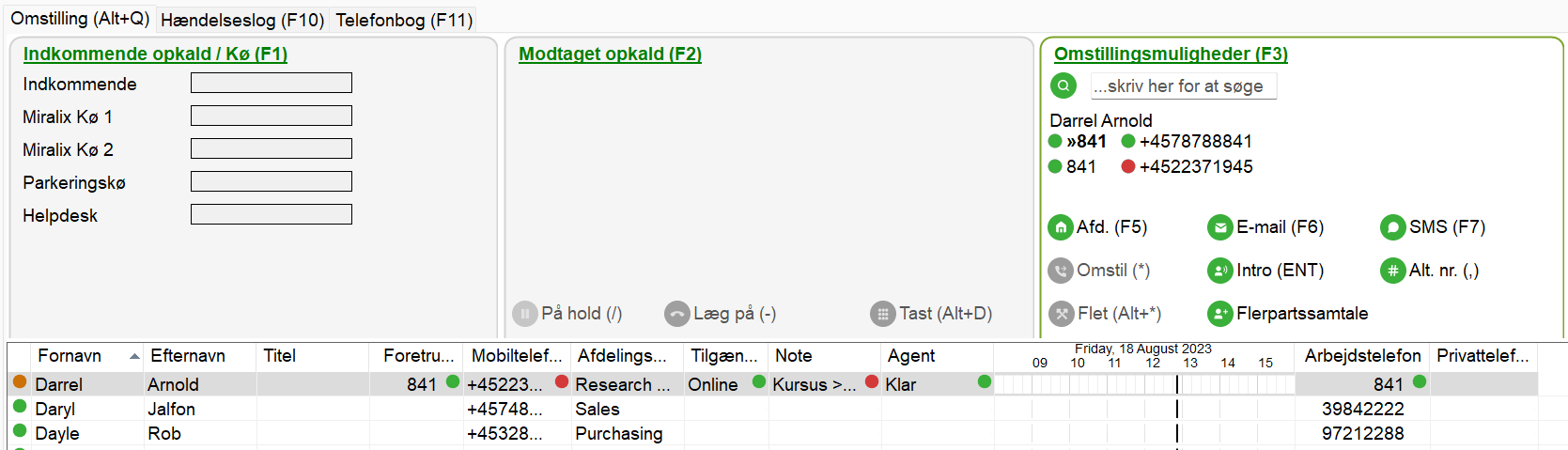 Oversigten herunder viser, hvad du ønsker at se om medarbejderne. Status på telefoner vises direkte i F3 fanen med farvesymboler, og overordnet status kan ses i søgeresultatet.
