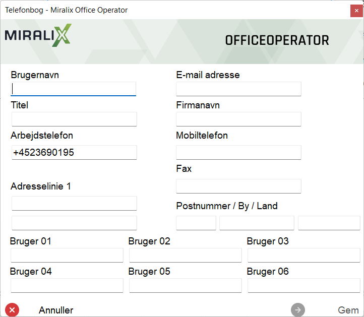 Nedenstående billede ses efter, at der er klikket på telefonbog-ikonet. Indtast oplysninger og tryk "Gem".