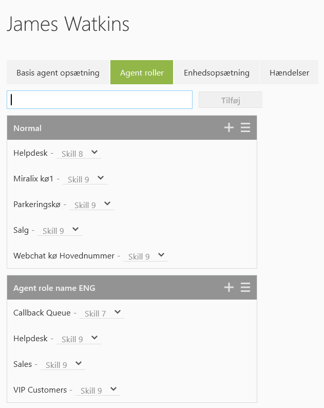 Nedenstående billede viser en liste over roller, som agenten har til rådighed. Roller benyttes f.eks. hvis en agent skal betjene forskellige køer på forskellige tidspunkter. Normal-rollen vil være til stede så snart en agent bliver tildelt en eller flere køer.