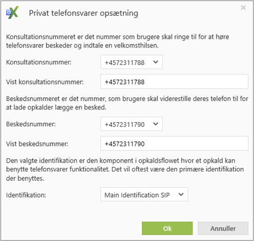 I opsætningen kan supervisoren vælge samme nummer i konsultationsnummer og beskednummer, da Miralix Office Team kan kende forskel på, om det er en bruger, der ringer ind til Telefonsvarer, eller om det er et opkald til en bruger, som har viderestillet sin telefon til telefonsvarer (+4572311790) (se nedenstående billede).