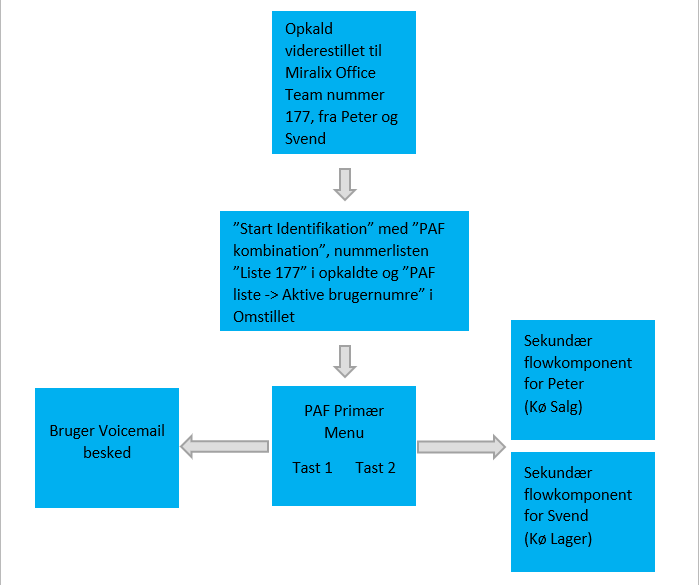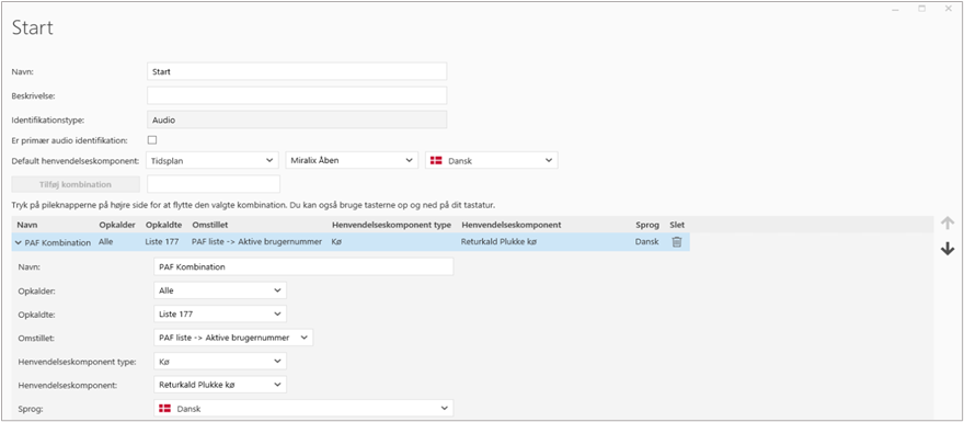 I Supervisor’s Værktøjskasse under Identifikation, er der oprettet en Kombination kaldet ”PAF Kombination”, hvor der i "Opkaldte" udvælges et vilkårligt nummer som kan benyttes til at viderestille til PAF. I dette eksempeI har Peter og Svend viderestillet deres telefon til nummeret på ”Liste 177”. I ”Omstillet” er nummerlisten, den førnævnte ”PAF Liste”, valgt. I ”Opkaldskomponents type” Kan der vælges hvor opkald skal routes hen til, hvis agenten IKKE har aktiveret personlig agent flow. Her er der valgt at disse opkald sendes til Kø- Returkald Plukke kø. Se nedenstående billede.