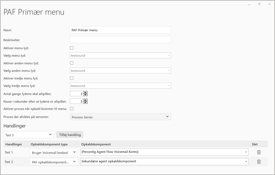 I Supervisor’s Værktøjkasse under Menu oprettes en ”Menu” som hedder ”PAF Primær menu”. Her defineres IVR muligheder, hvor tast 1 er valgt til ”Bruger Telefonsvarer besked”- ”Personlig Flow Telefonsvarer Konto”. Tast 2 er valgt som ”PAF Flowkomponenter ”- ”Sekundære agent Flowkomponent” som vist på nedenstående billede.