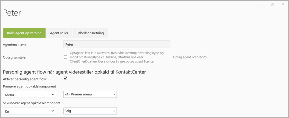 I Agent fanen under agent indstillinger er ”Peter” aktiveret med ”Aktiver personlig agent flow” med menuen ”PAF Primær Menu” i ”Primær agent opkaldskomponent” og køen ”Salg” i ”Sekundær agent opkaldskomponent” som vist på nedenstående billede.