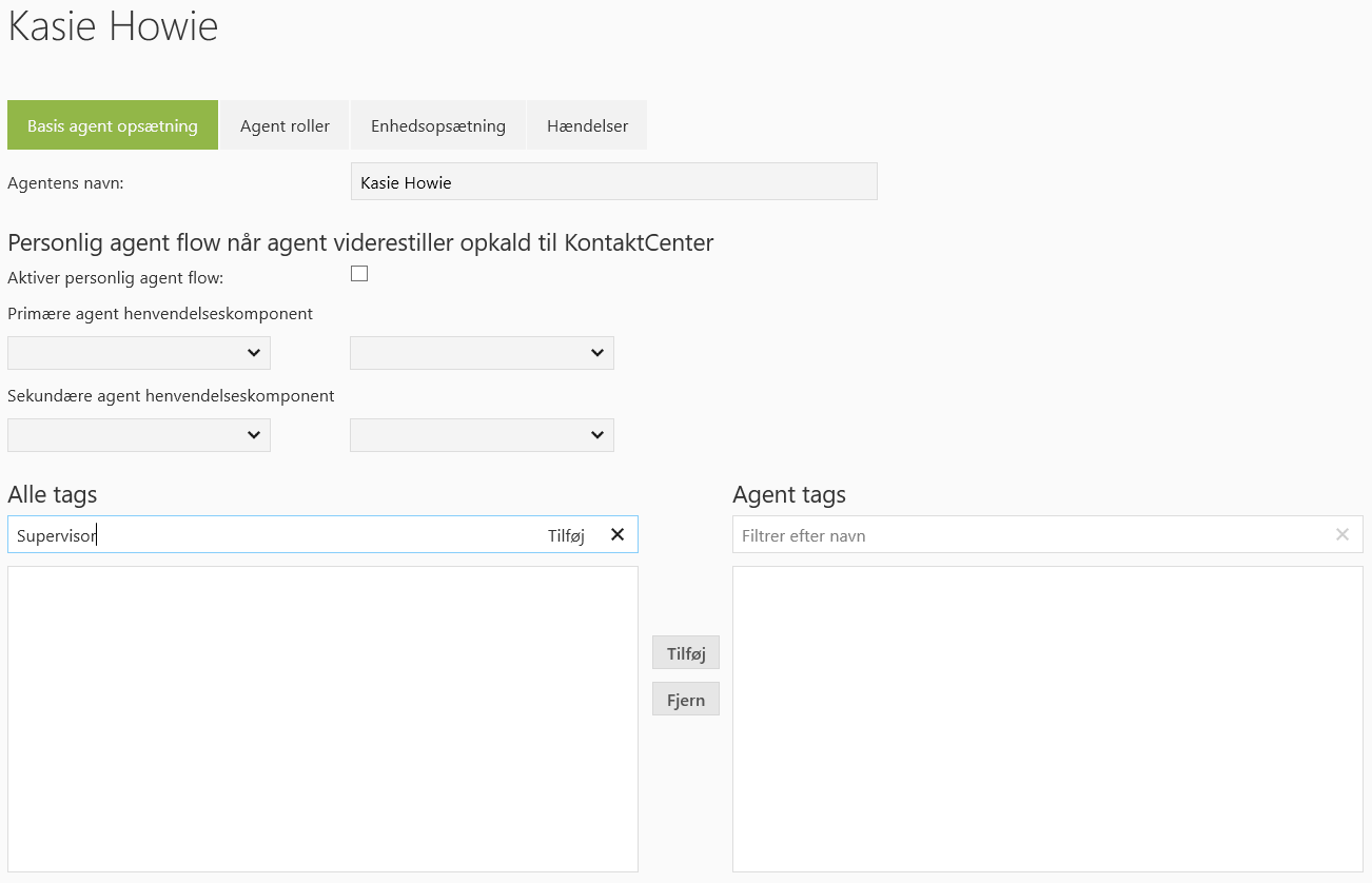 Her kan Supervisor oprette tags. Tags benyttes til statistik, f.eks. hvis et firma har 50 køer og 500 agenter, så kan agenten sætte et tag som hedder ”salg” på alle agenter, som har noget med salg at gøre. Dermed laves separat statistik på alle agenter med tagget ”salg”.