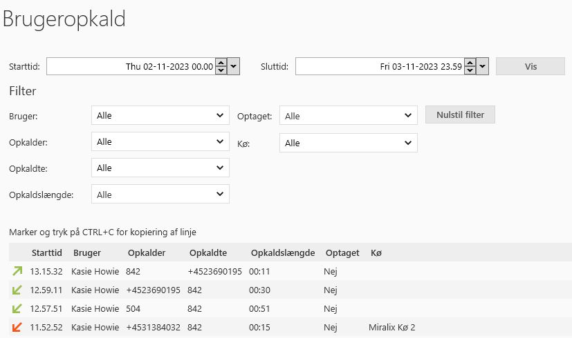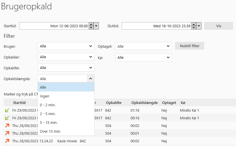 Der er mulighed for at filtrere på brugeropkaldene i listen ved at bruge drop-down menuerne under "Filter".