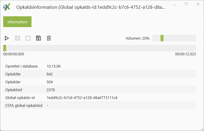 Her kan optagede samtaler afspilles via knapperne øverst i vinduet, hvor samtalen også kan gemmes på PC’en, eller slettes helt. Nedenfor ses en række data på brugeropkaldet.