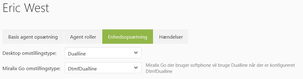 Miralix Office Team skal køre med OtCsta aktiveret og Agent skal sættes til mobil omstillingstype: DTMF Dualline (InShare) eller Dualline (Miralix Go)