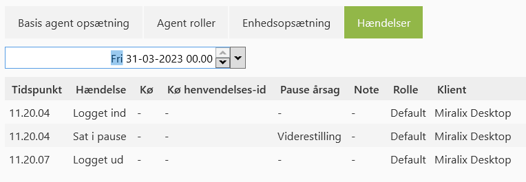 Nedenstående billede vises en liste over hændelser den pågældende agent har foretaget sig. Det er muligt at sortere ud fra hvilken dato man ønsker at se.