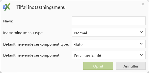 ”Direkte opkald” benyttes i forbindelse med direkte opkald til en agent uden at Miralix Office Team er involveret i opkaldet. Navngiv indtastningsmenuen, vælg indtastnings menu type, direkte opkald og klik på opret. Der skal ikke vælges Flowkomponent da denne menu type kun kan benyttes til at starte en proces lokalt hos agenten.