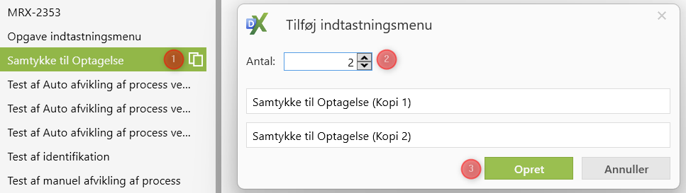 Klik på en eksisterende indtastningsmenu, og nu vil der blive vist et lille ikon ud for menu navnet (1). Heri kan der vælges et antal nye indtastningsmenuer (2) og de kan tildeles navne. Klik på ”Opret” (3) og indtastningsmenuerne er nu oprettet.