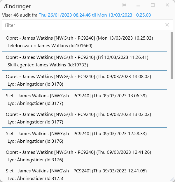 Handlingen på flowkomponenten bliver gemt, og hvem der har foretaget handlingen, tidspunktet for handlingen, og hvilken flowkomponent handlingen blev udført på.