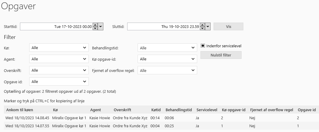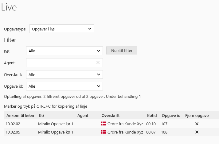 Listen opdateres live af opgaver, som venter i kø, eller som er i gang. Her er også mulighed for at filtrere på opgaverne, der står i kø således, at der kun ses opgaver til en specifik kø. Her er mulighed for at filtrere på forskellige parameter.