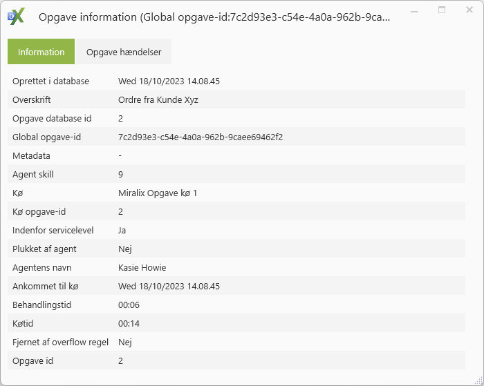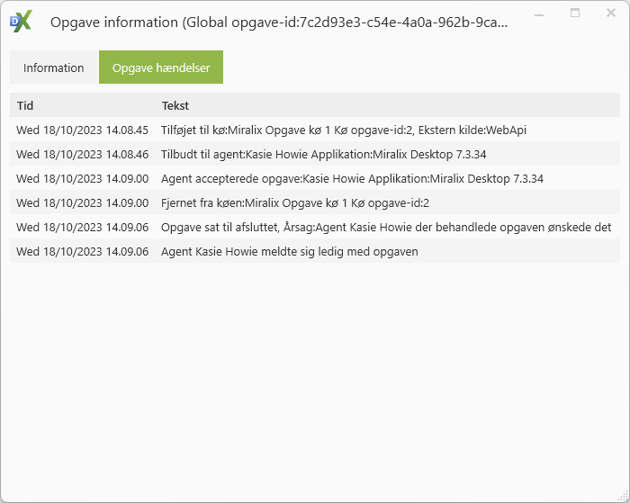 Ved klik på opgave hændelser ses nu opgave hændelser i kronologisk rækkefølge (se nedenstående billede), og disse kan bruges til fejlfinding.