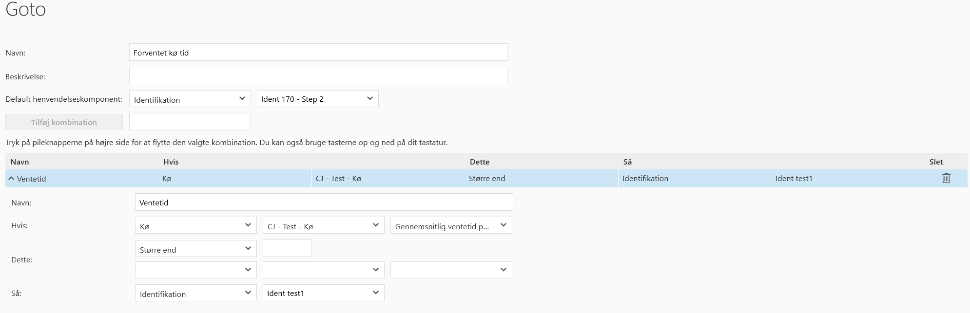 Goto komponenten benyttes til at sammenligne tilstande i andre Flowkomponenter og derudfra afgøre, hvor et opkald skal sendes hen. Det kan f.eks. være som vist i nedenstående billede, hvor opkald sendes til Miralix Kø2, hvis der er færre agenter ledige i Miralix Kø1, end i Miralix Kø2. Hvis der er det samme antal eller flere agenter ledige i Miralix Kø1, vil Default Flowkomponenten blive benyttet, da kravet ”Mindre end” i feltet ”Dette” ikke er opfyldt.