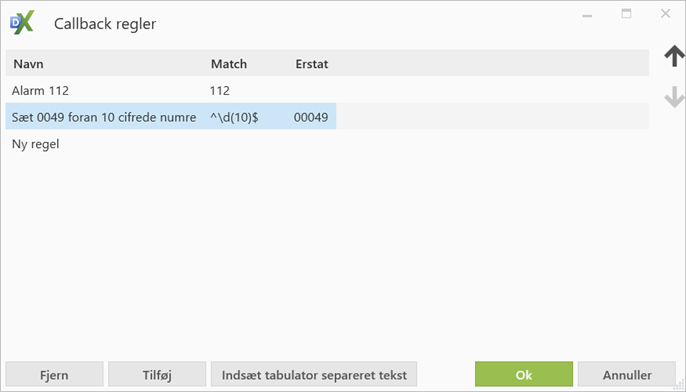 Tilføj ny regel ved at klikke på ”Tilføj”, der vil nu blive vist ”Ny regel” på listen, og denne kan redigeres ved at klikke i feltet under ”Match” eller ”Erstat”. Indsæt tabulator separeret tekst kan benyttes, hvis der kopieres regler fra eks. Excel. Klik på Ok når konfigurationen er udført.