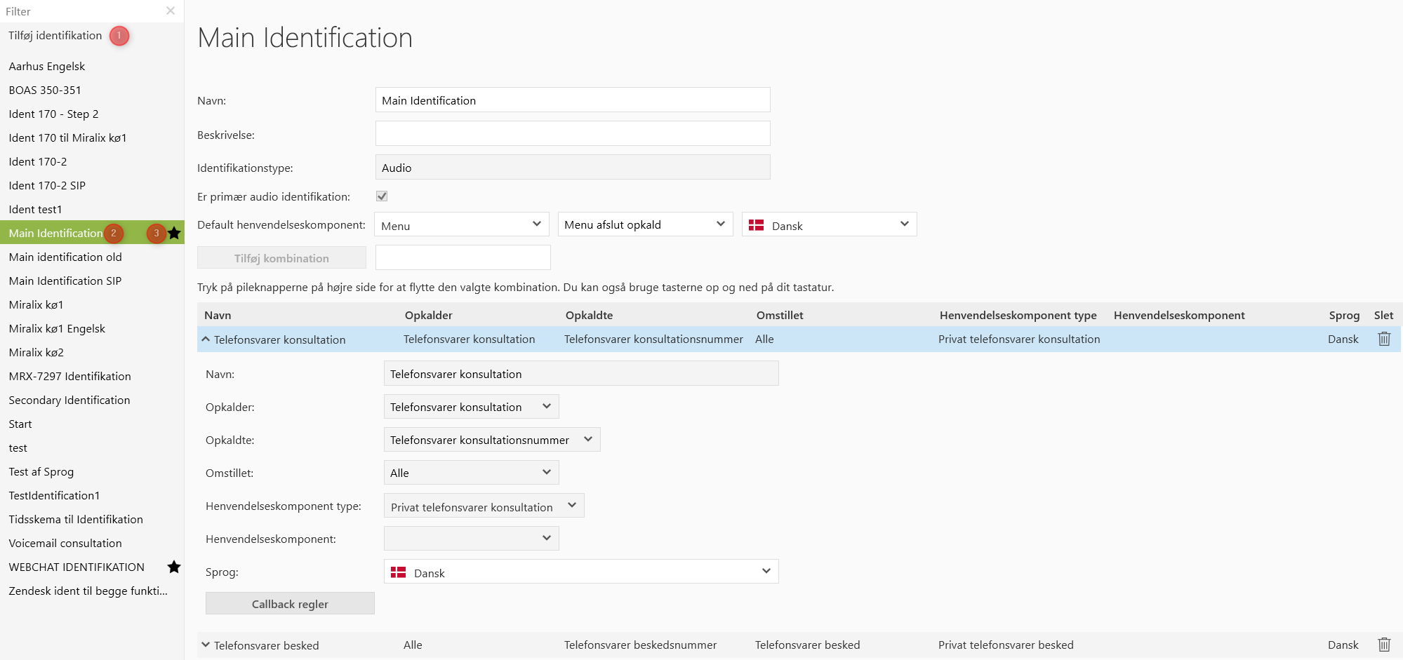 Ved klik på ”Identifikation” under ”Værktøjskasse” kan der oprettes ny Identifikation ved at klikke på ”Tilføj Identifikation” (1), eller der kan redigeres i en eksisterende identifikation ved at klikke på den i listen (2), herefter ses nedenstående billede. Identifikationskomponenter kan indsættes et hvilket som helst sted i opkaldsflowet. Hvis der er oprettet flere identifikationer, vil den “primære” identifikation være markeret med en stjerne (3).