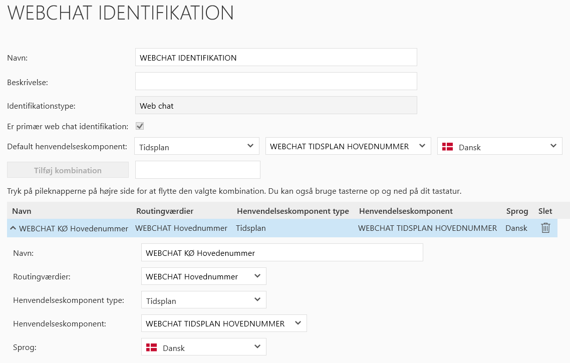 Er primær web chat identifikation: | Når denne funktion aktiveres, sættes identifikationskomponenten som primær, og denne kan ikke slettes. Den primære identifikationskomponent er det sted, hvor alle opkald påbegynder opkaldsflow. |
