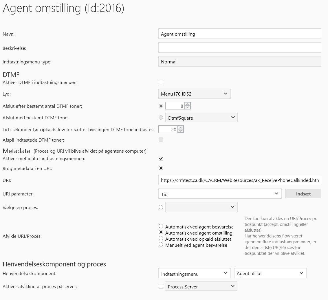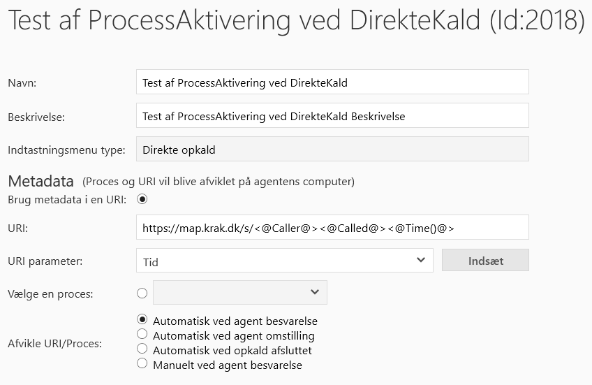 Afvikle Proces: | Vælges Automatisk vil metadata blive afviklet automatisk på agentens PC, når agenten modtager opkaldet, omstiller opkaldet, eller efter opkaldet er afsluttet. Vælges Manuelt, skal agenten klikke på link for at afvikle metadata. Der kan kun afvikles en URI/Proces pr. Tidspunkt, dog er det muligt benytte flere processer så længe det ikke er af samme type. Har henvendelsen været igennem flere indtastningsmenuer, er det den sidste URI/Proces for tidspunktet der vil blive afviklet. |