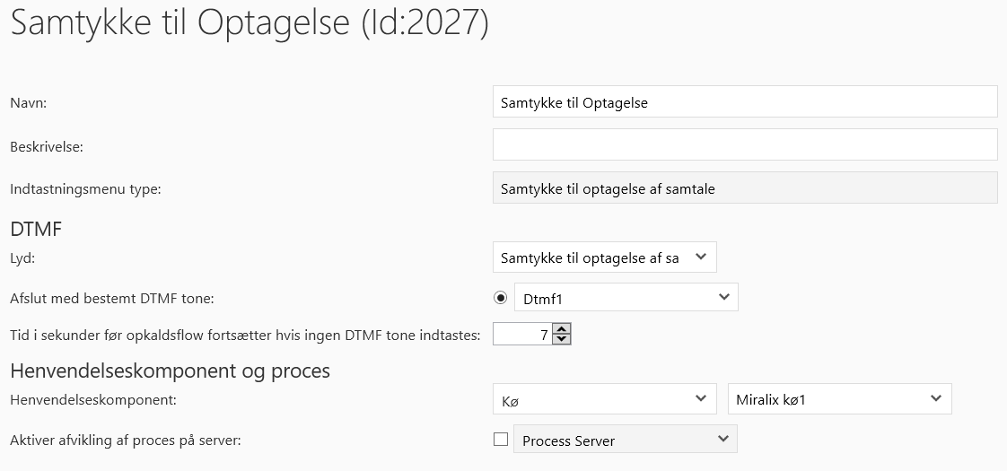 I nedenstående billede vises opsætningen for typen ”Samtykke til optagelse af samtale” hvor opkalder vælger om samtalen med agenten må optages.