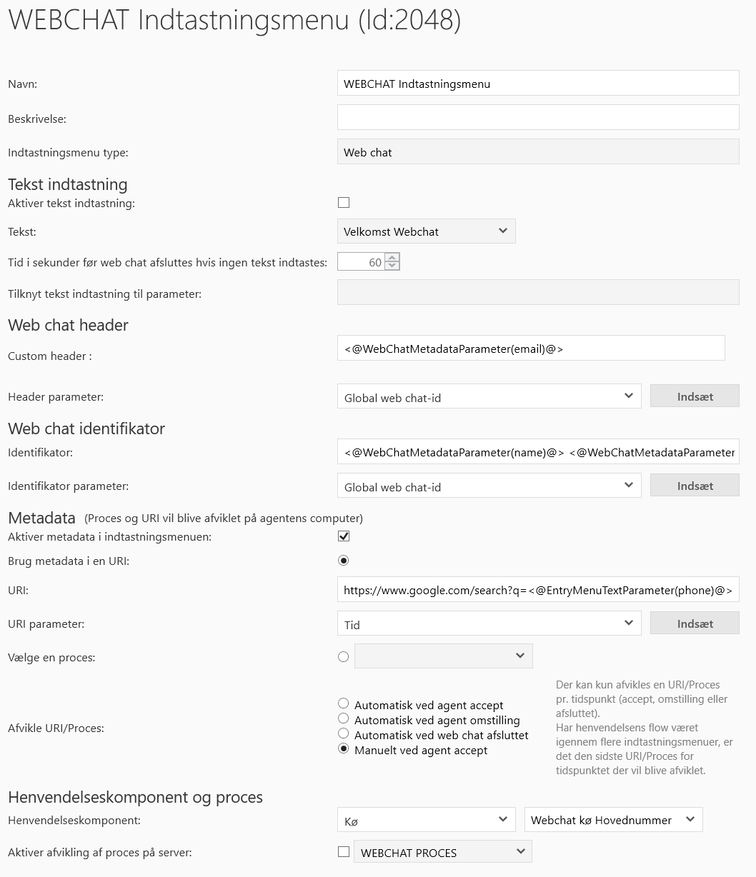 Aktivér metadata i indtastningsmenuen: | Såfremt denne funktion aktiveres, vil metadata blive afleveret hos agenten enten via en URI med valgt Web chat data eller som en proces. (Se Opsætning af proces) |