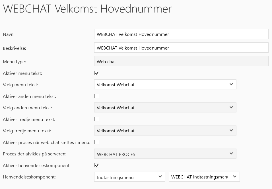 Aktivér proces når web chat sættes i menu: | Når denne funktion er slået til, afvikles en proces, når web chat’en kommer til menuen. |