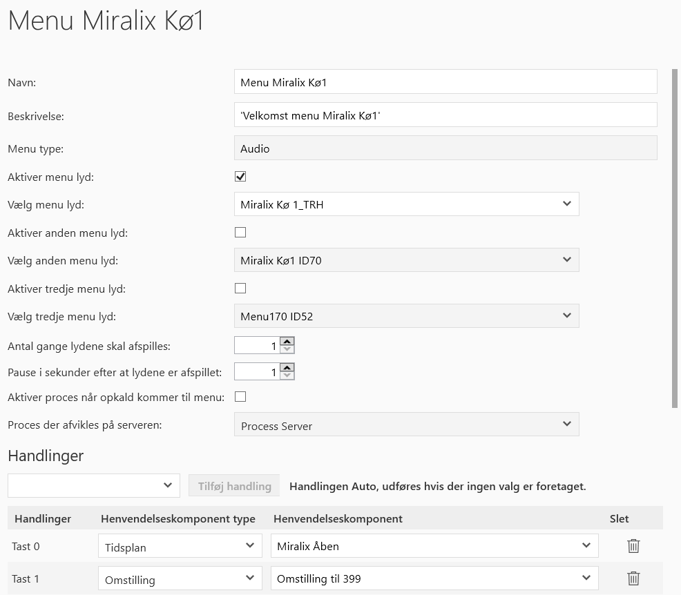 Aktivér proces når opkald kommer til menu: | Når denne funktion er slået til, afvikles en proces, når opkaldet kommer til menuen. |