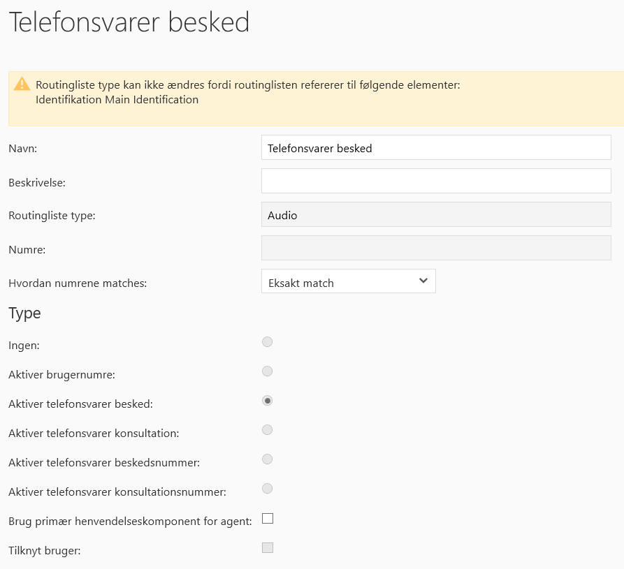 Når der er tilføjet en Routningsliste, skal denne opsættes. Opsætningen af en Audio Routningsliste kan ses i nedenstående billede. Routningslisten benyttes til at identificere opkaldet i identifikationskomponenten.