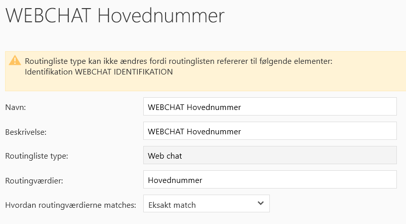 Opsætningen af en Web chat routningsliste kan ses i nedenstående billede. Routningslisten benyttes til at identificere Web chat i identifikationskomponenten.