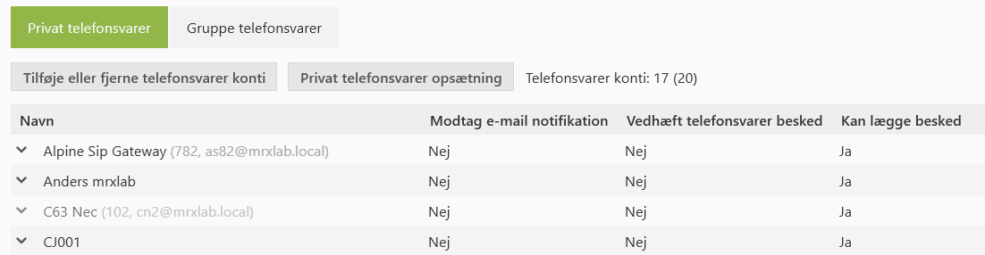 Husk at en bruger med Voicemail konto ikke må dele lokalnummer med andre brugere.