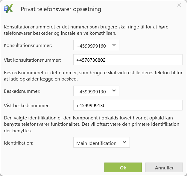 Vist konsultationsnummer: Her angives det eksterne nummer som brugere skal ringe til for at aflytte beskeder. Nummeret benyttes i forbindelse med Notifikation, som afsender en SMS til agenter, der har ubesvarede opkald og deraf indtalte telefonsvarer beskeder.
