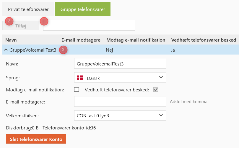 Tast et navn i tekstfeltet (1) og klik på knappen “Tilføj” (2). Den nye gruppe telefonsvarer vises nu på listen nedenfor.