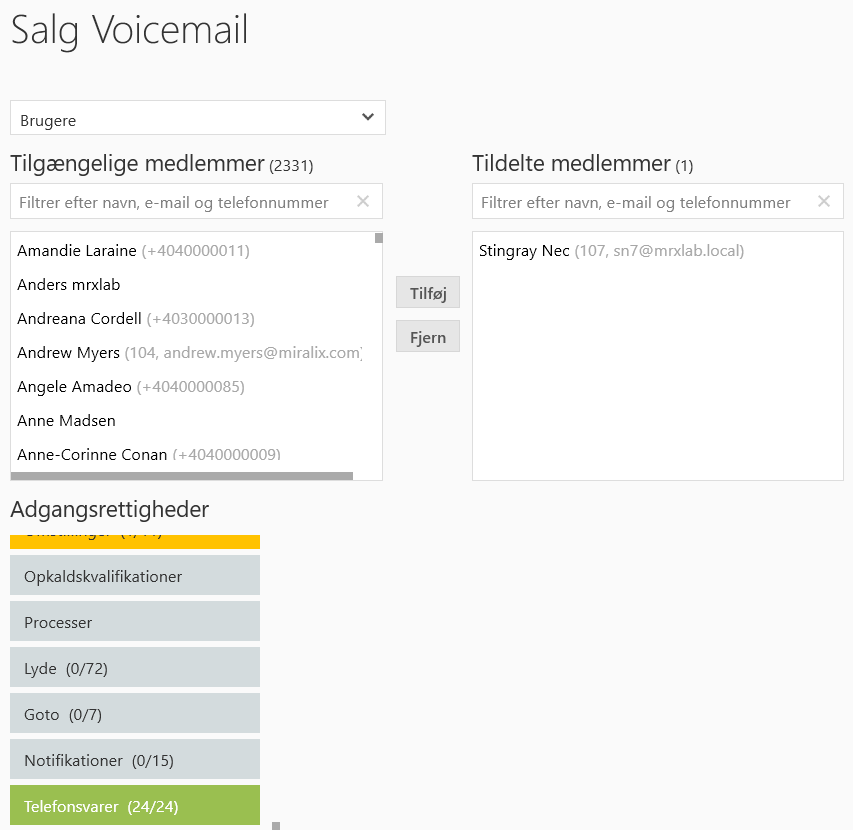 Vælg ”Adgangsrettigheder” i menuen til venstre og vælg ”Tilføj adgangsgruppe”. Indtast et navn til adgangsgruppen og klik på opret. Klik på den nyoprettede adgangsgruppe og vælg ”Telefonsvarer” i listen ”Adgangsrettigheder”.