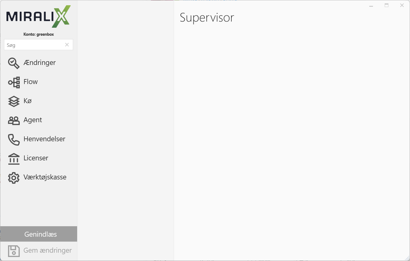 Du tilgår Supervisor ved at klikke på menu-ikonet i Miralix Desktop og vælge “Supervisor”. Supervisor vinduet er delt ind i en menu til venstre og et indholdsfelt til højre. Menuen til venstre består af: