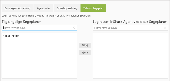 Fanen Telenor Søgeplan er kun aktiv på agenter der er oprettet med Miralix Inshare, og har kaldskontrol via MPGWcsta.