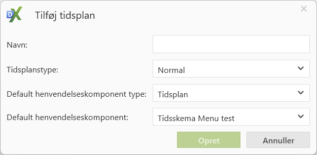 Ved klik på ”tilføj tidsplan” under ”Tidsplan” ses billedet nedenfor.