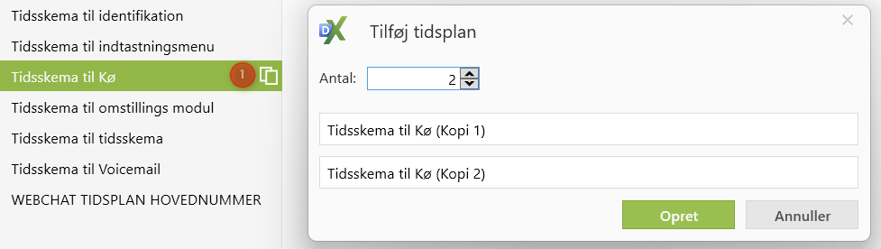 Klik på en eksisterende tidsplan, og klik på ikonet, der vises ud for navnet (1). Heri kan der vælges et antal nye kopier, og de kan tildeles navne. Klik på ”Opret” og tidsplanerne er nu oprettet.