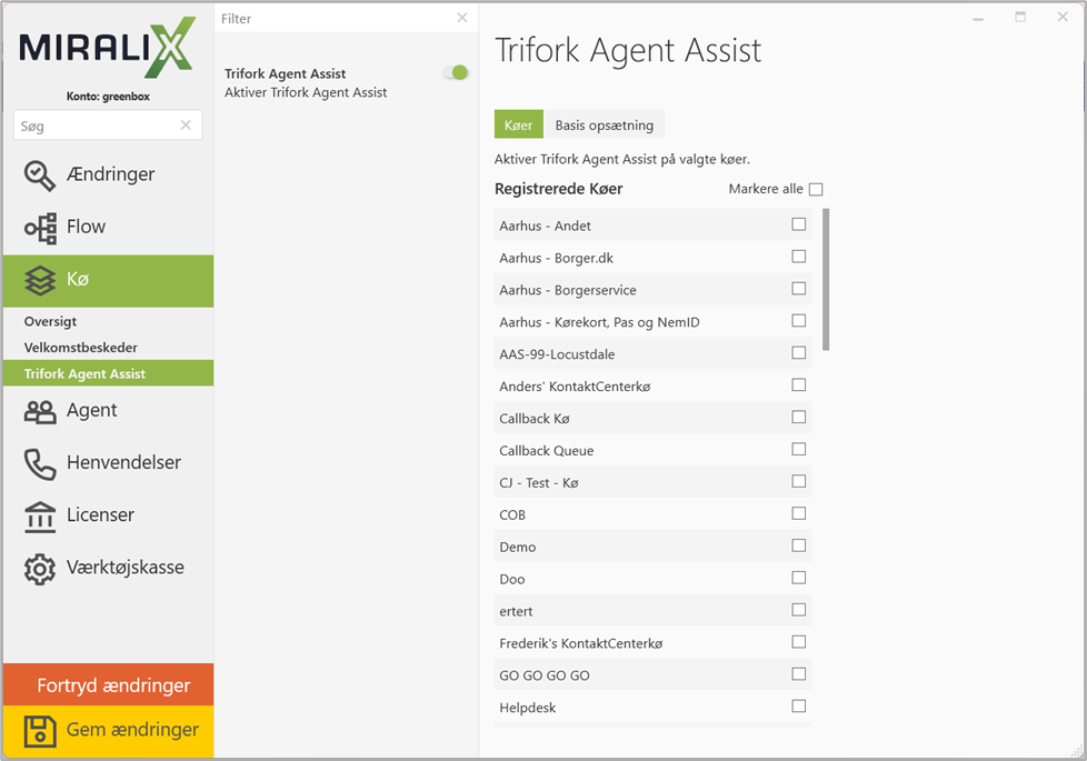 Featuren kan aktiveres/deaktiveres for hele Miralix løsningen ved at bruge toggle-knappen. Herunder kan du vælge "Køer" og "Basis opsætning". Under "Køer" kan du udvælge alle eller specifikke Miralix køer, hvor Trifork Agent Assist skal benyttes. Under "Basis opsætning", skal informationerne, der bliver udleveret af Trifork, indtastes.