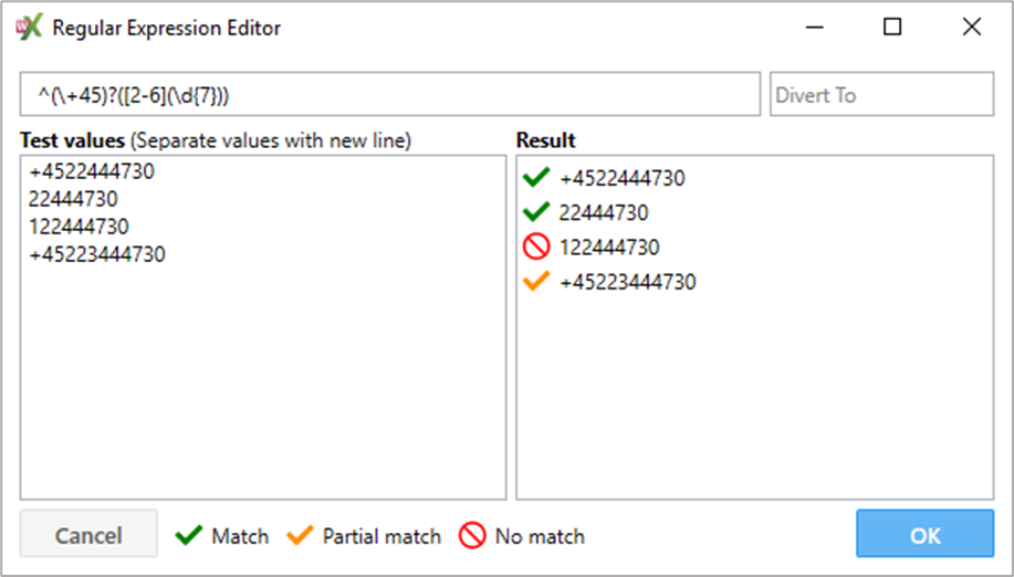 Regular Expression Editor bruges til at redigere og teste nedenstående regler for genkendelse af telefonnumre, som benyttes i flere Miralix programmer: